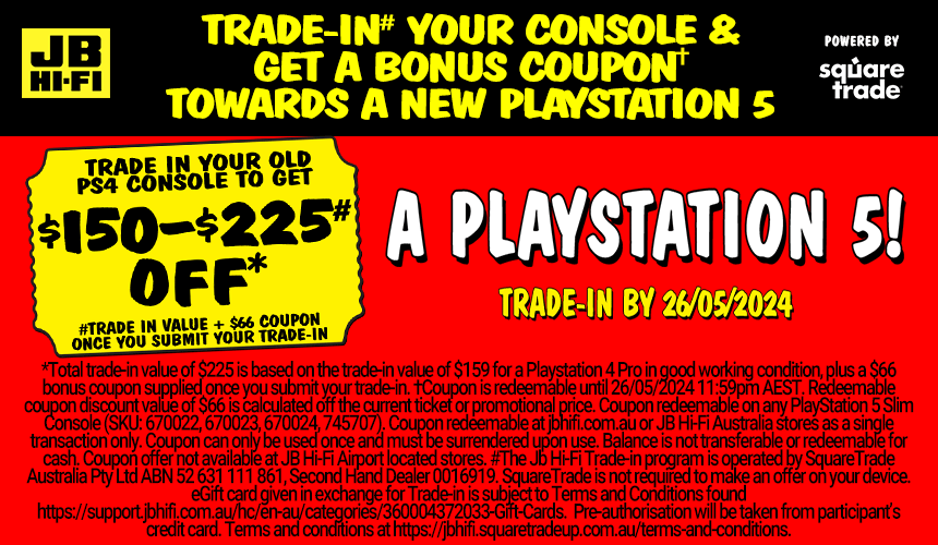 The way it works is that customers who want to trade in their old machine towards a PlayStation 5 Slim at JB Hi-Fi can go through the usual trade process via the JB website, get their trade-in credit (up to $159 for a PS4 Pro) and then earn an extra $66 voucher on top to redeem for a PS5 before May 26th at 11:59PM AEST.