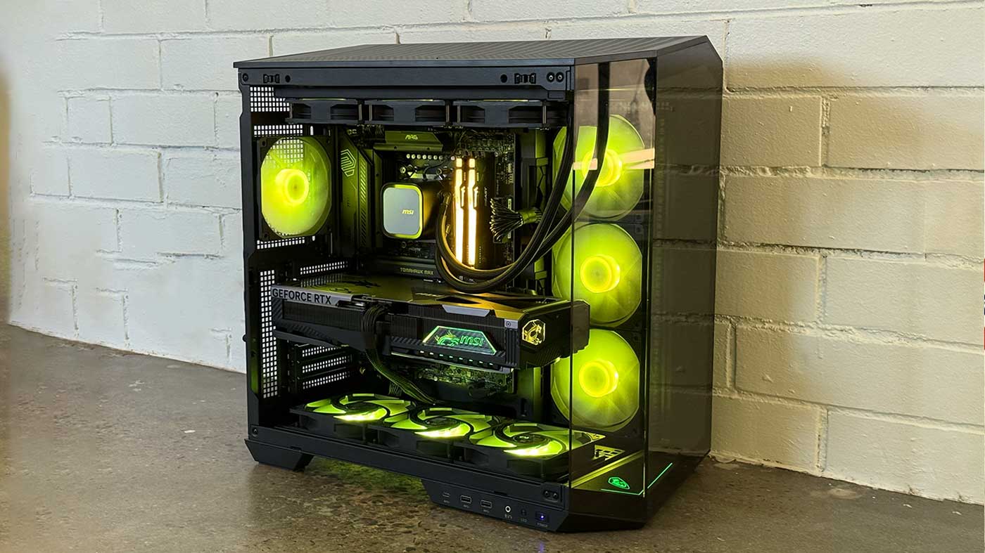 The most natural place to start talking about this build is with the case. It features the MSI MAG Pano 100R PZ case, which offers 270-degree panoramic views of all components, fans, and coolers, and it’s absolutely stunning to look at. It’s obviously on the larger side, but it still feels minimalist in how it looks and showcases all of your components.